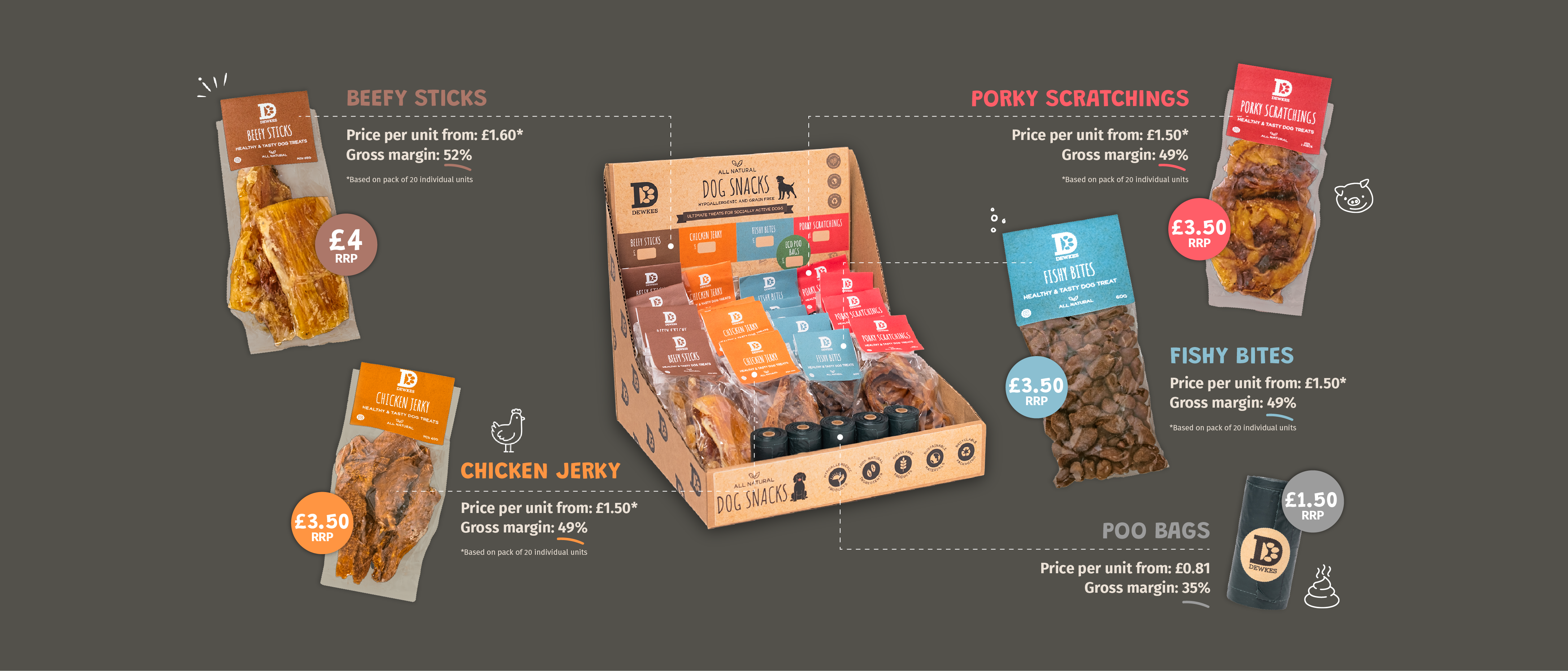 Welcome four-legged guests and keep owners ordering another pint with natural, grain-free dog treats that pay their way. Dewkes makes it simple for pubs and bars to offer dog snacks that drive dwell time and extra spend.